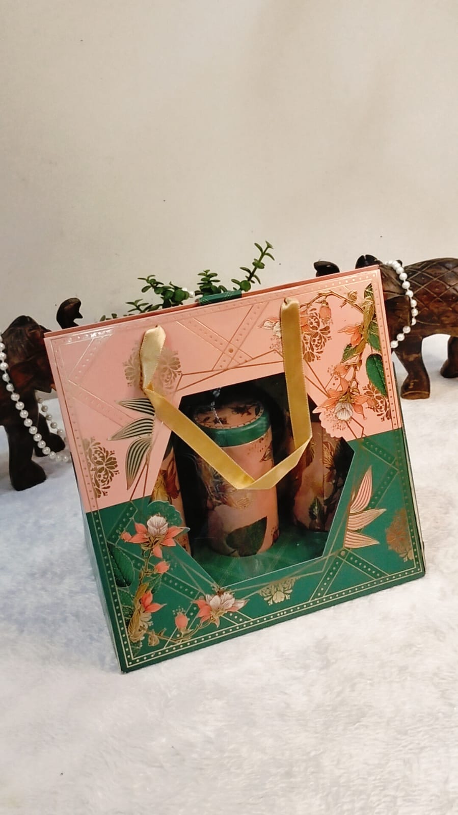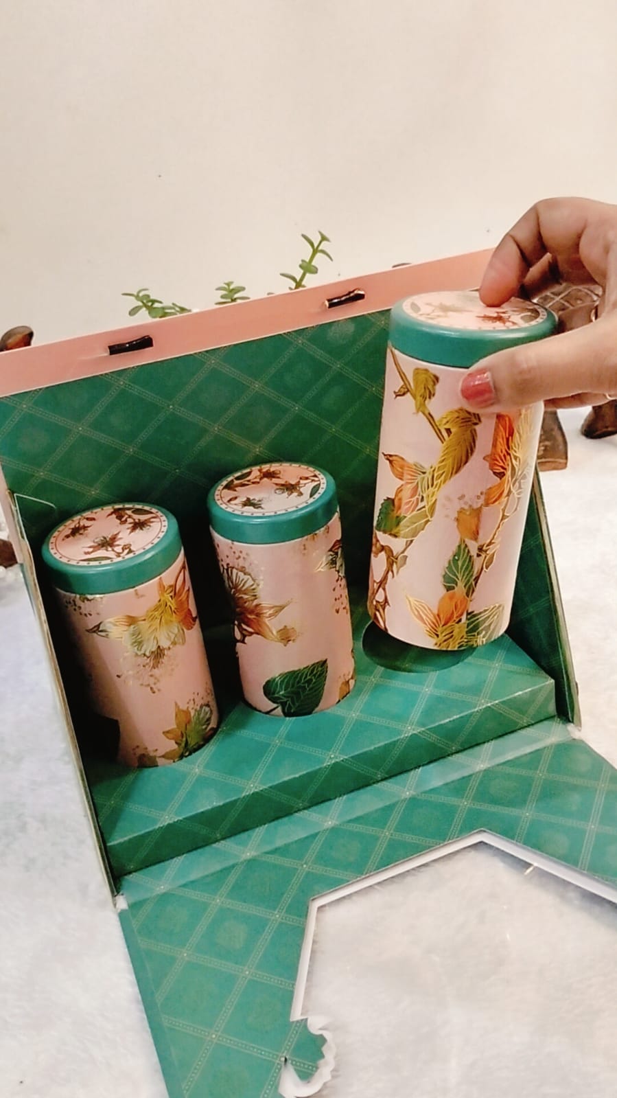 Make your gifting stand out with this luxurious floral printed pyramid box, featuring 3 stylish jars. Perfect for dry fruits, chocolates, tea, coffee, or spices, this premium set is designed to leave a lasting impression.