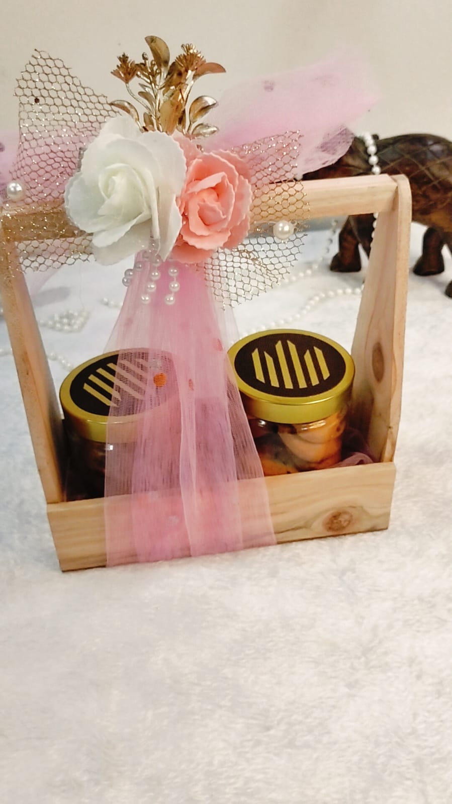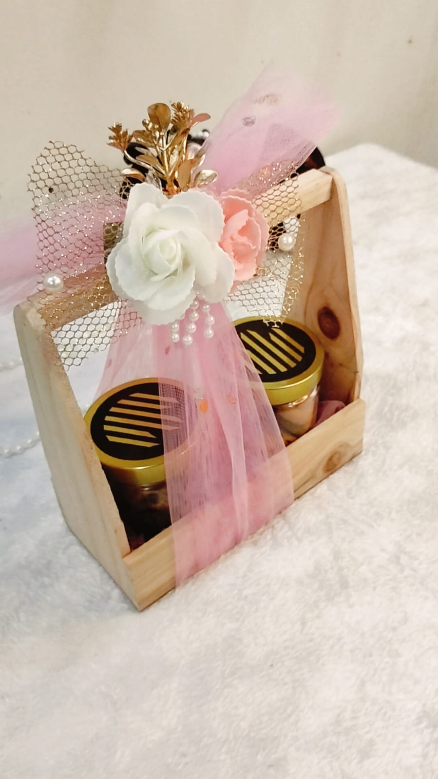 Add a touch of natural charm and elegance to your gifting with this premium pinewood box containing two stylish glass jars. Thoughtfully wrapped with soft pink net, floral embellishments, and golden accents, this gift set is perfect for festivals, weddings, and special celebrations.