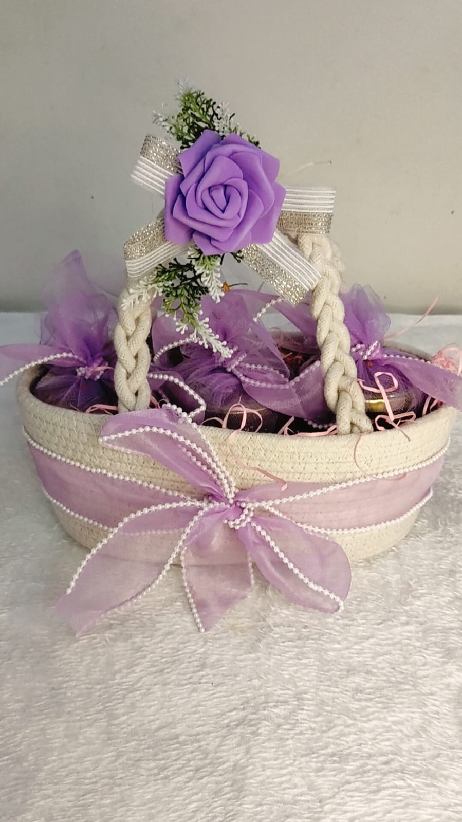 Add a touch of charm to your gifting with this beautifully handcrafted cotton basket, decorated with purple floral accents and elegant pearl detailing. This premium basket includes 4 multi-purpose jars, perfect for dry fruits, chocolates, sweets, or spices, making it an ideal choice for thoughtful gifting.