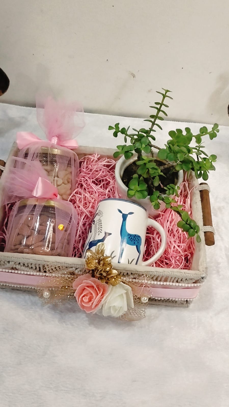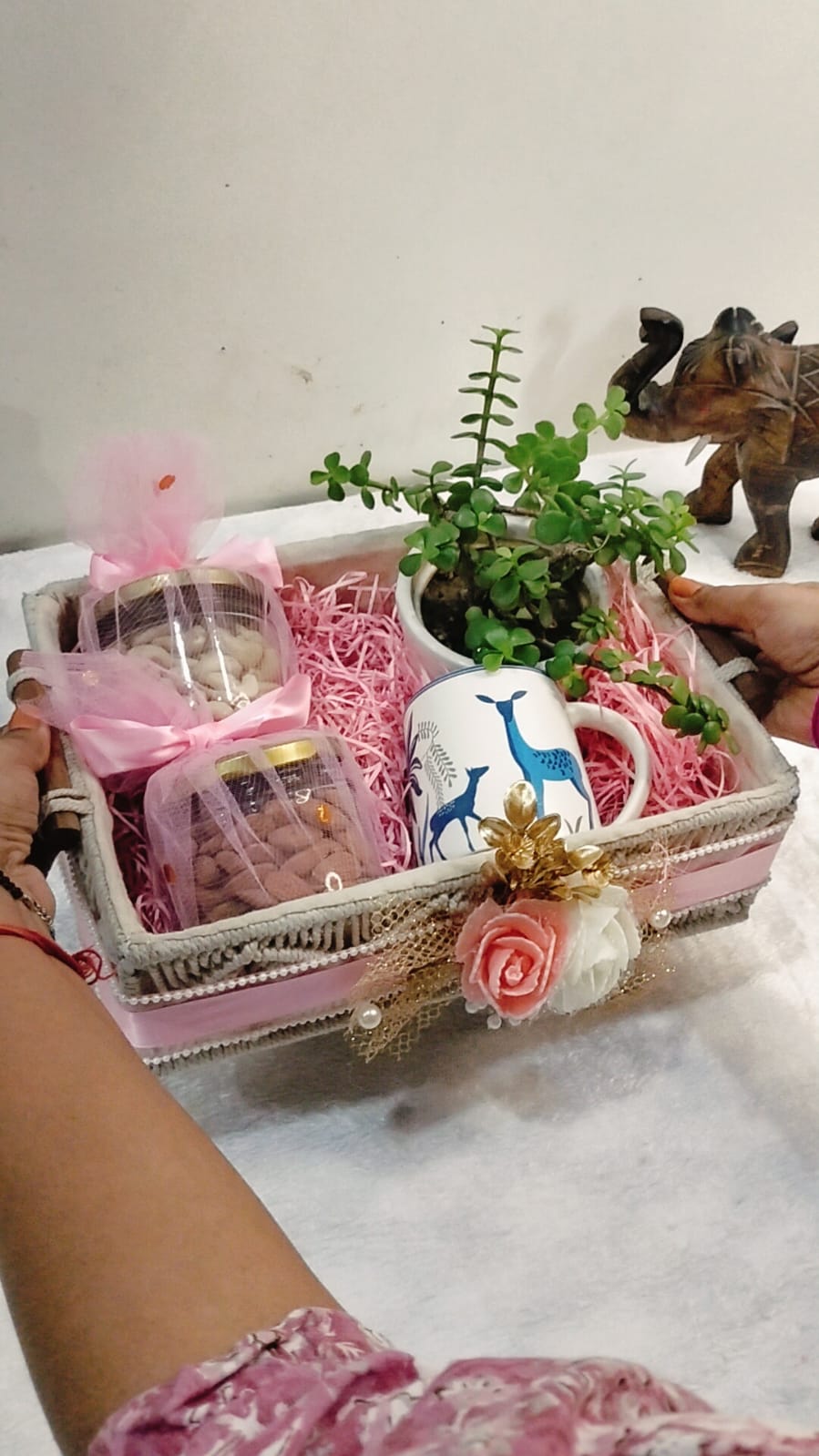 Make your celebrations extra special with this luxury handcrafted macrame gift basket. Beautifully decorated with pearls, soft pink accents, and floral embellishments, this basket exudes elegance and warmth. π