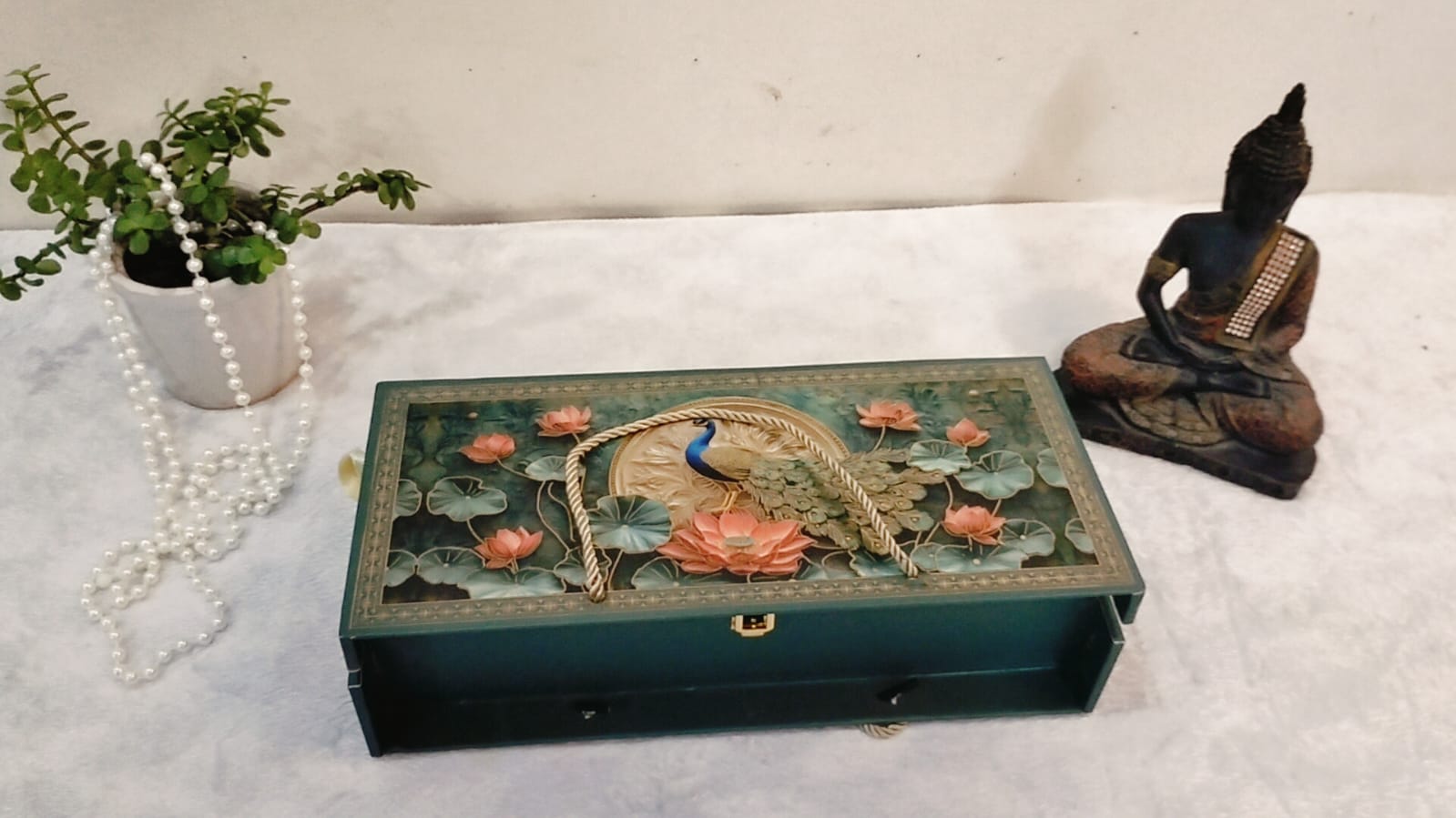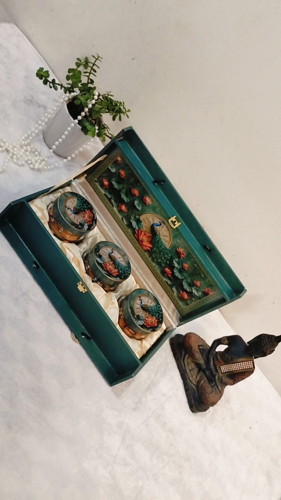 Crafted with premium quality MDF, this elegant green box features a handcrafted 3D peacock motif surrounded by floral artwork, symbolizing beauty and prosperity. Inside, you’ll find three glass jars with matching decorative lids, perfect for storing dry fruits, chocolates, cookies, or snacks.