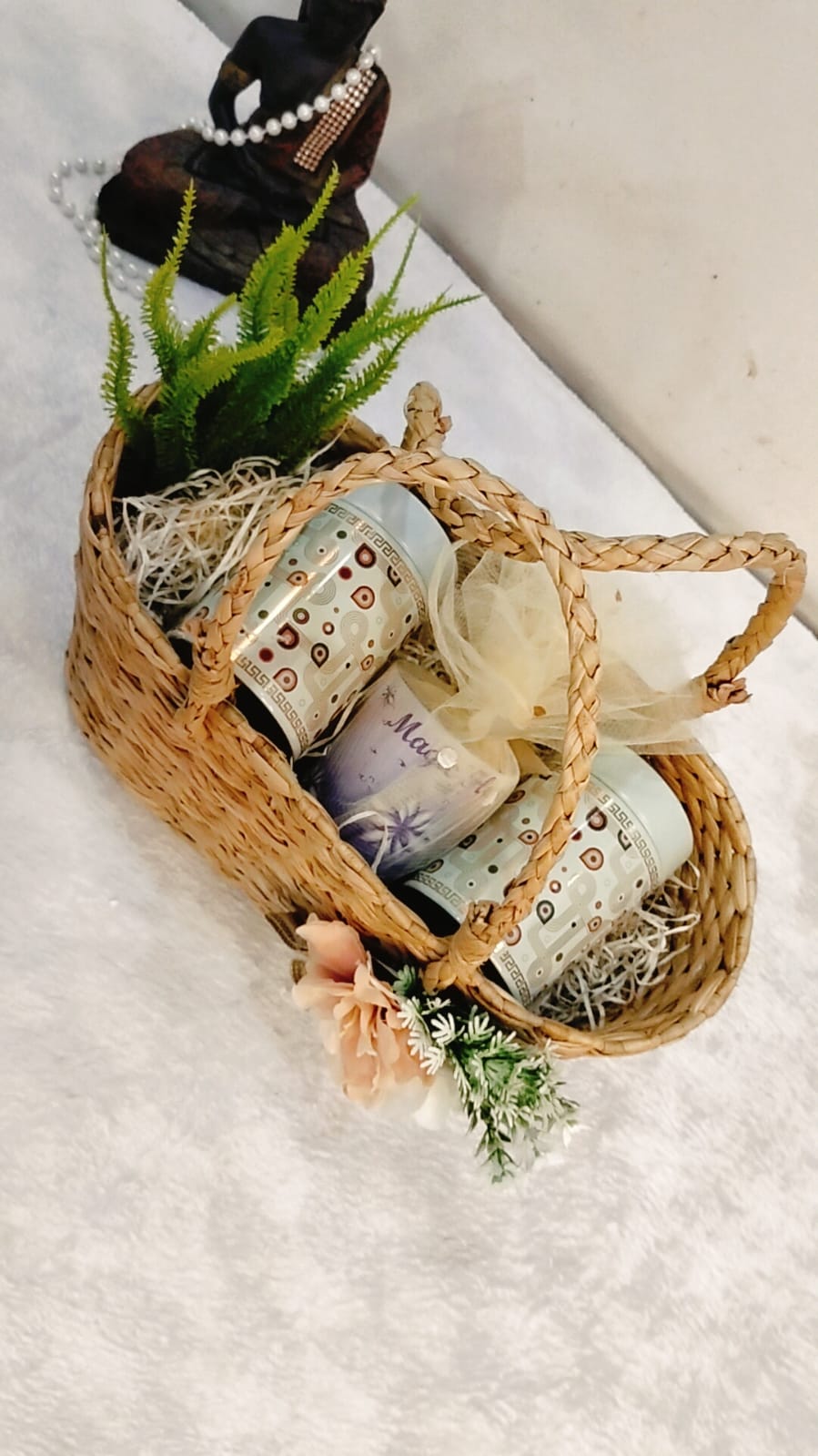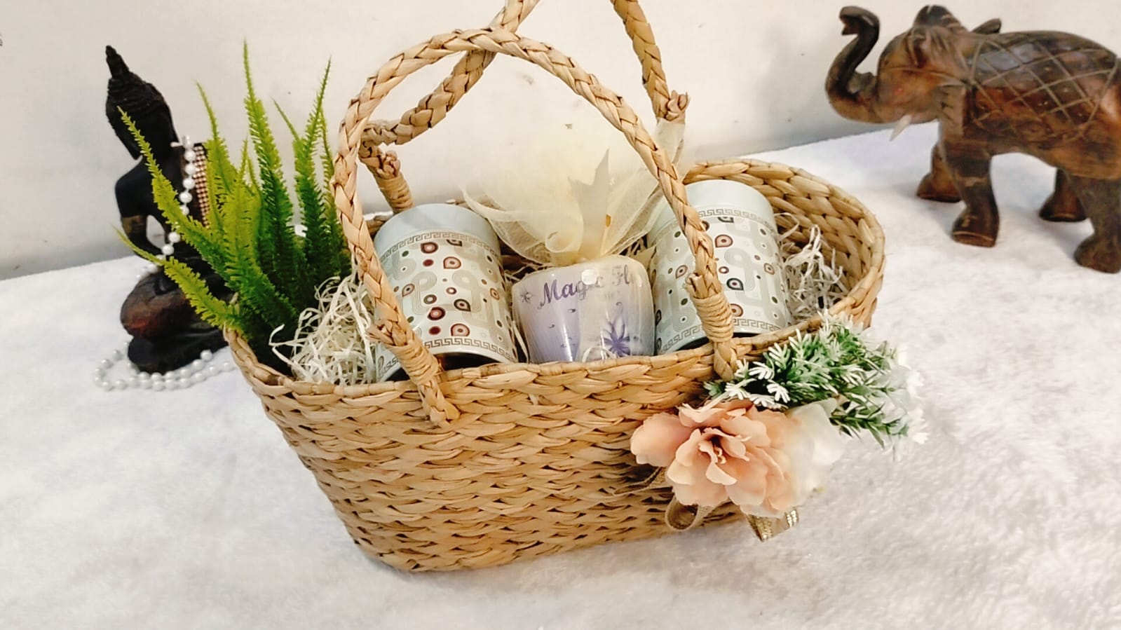 Bring joy to your loved ones with this beautifully handcrafted woven gift basket. Featuring a natural and earthy design, this basket is decorated with charming flowers, lush greenery, and a premium satin ribbon, making it a perfect blend of simplicity and elegance. 🌼