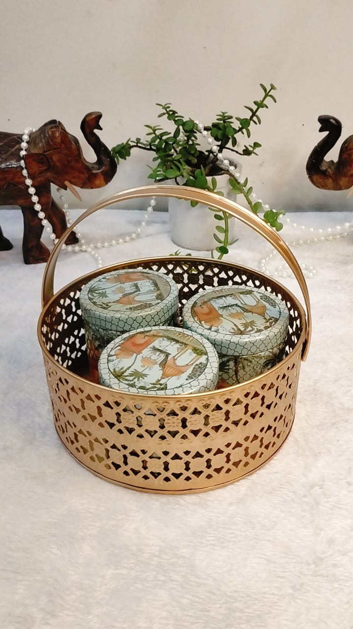 Premium Golden Metal Basket with 3 Decorative Jars – Perfect for Festive Gifting