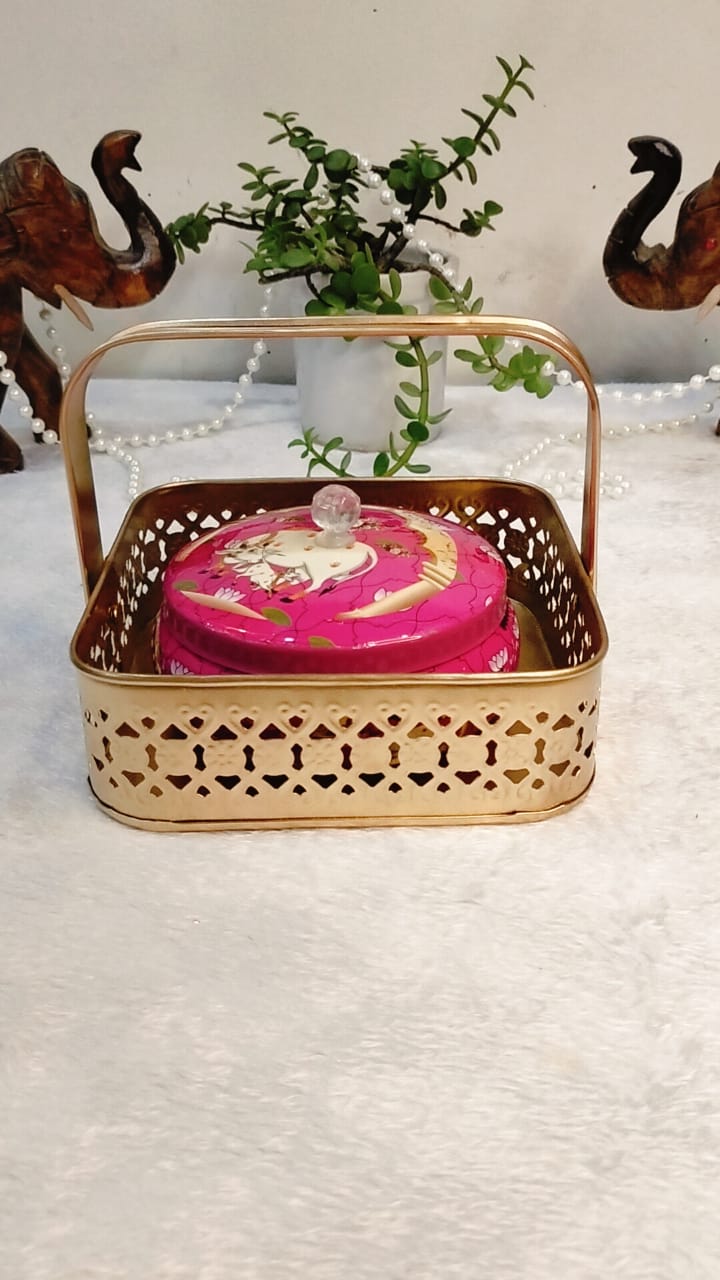 Elevate your gifting game with this premium Pichwai design jar beautifully placed in a golden metal tray with intricate cut-out detailing.