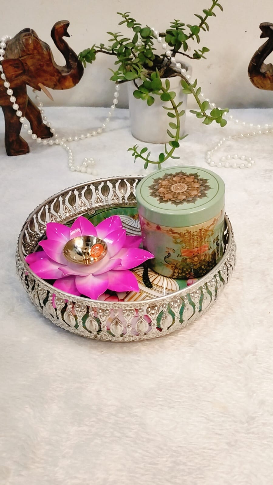 Bring home a touch of tradition and elegance with this luxurious silver-toned round tray featuring a Pichwai design jar and a beautiful lotus diya.